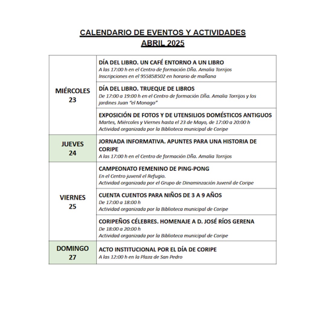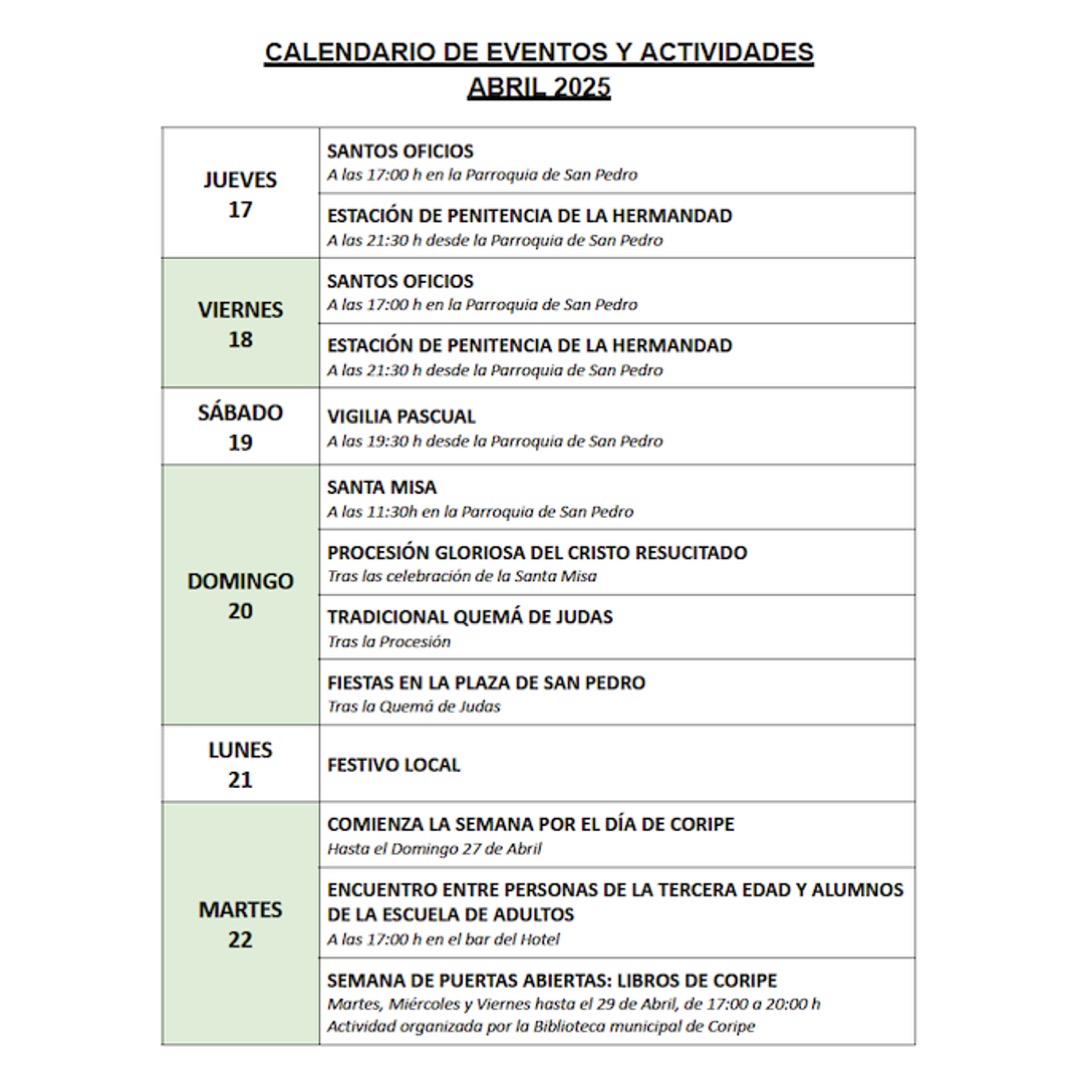 Publicado el calendario de actividades para este mes de Abril de 2025