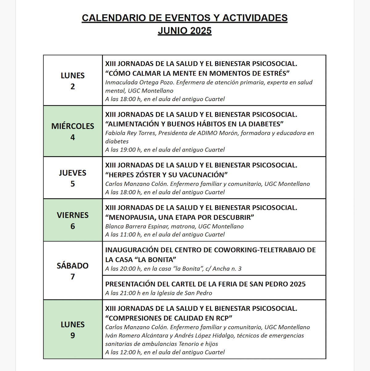 Publicado el calendario de actividades para este mes de Junio de 2025