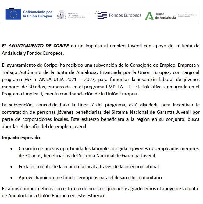 El ayuntamiento de Coripe, ha recibido una subvención de la Consejería de Empleo, Empresa y Trabajo Autónomo de la Junta de Andalucía, financiada por la Unión Europea, con cargo al programa FSE + ANDALUCIA 2021 – 2027, para fomentar la inserción laboral de jóvenes menores de 30 años, enmarcada en el programa EMPLEA – T.