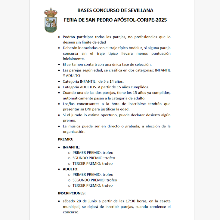 El mismo Sábado 28 de junio a partir de las 17:30 horas, en la caseta municipal, se dejará de inscribir parejas, cuando comience el concurso.