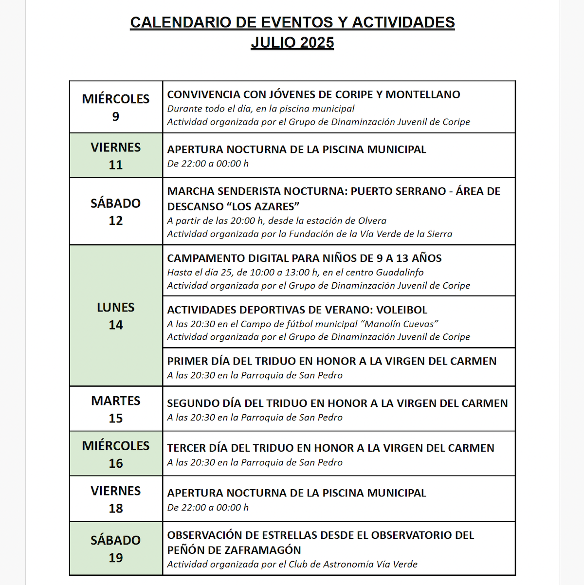 Publicado el calendario de actividades para este mes de Julio de 2025