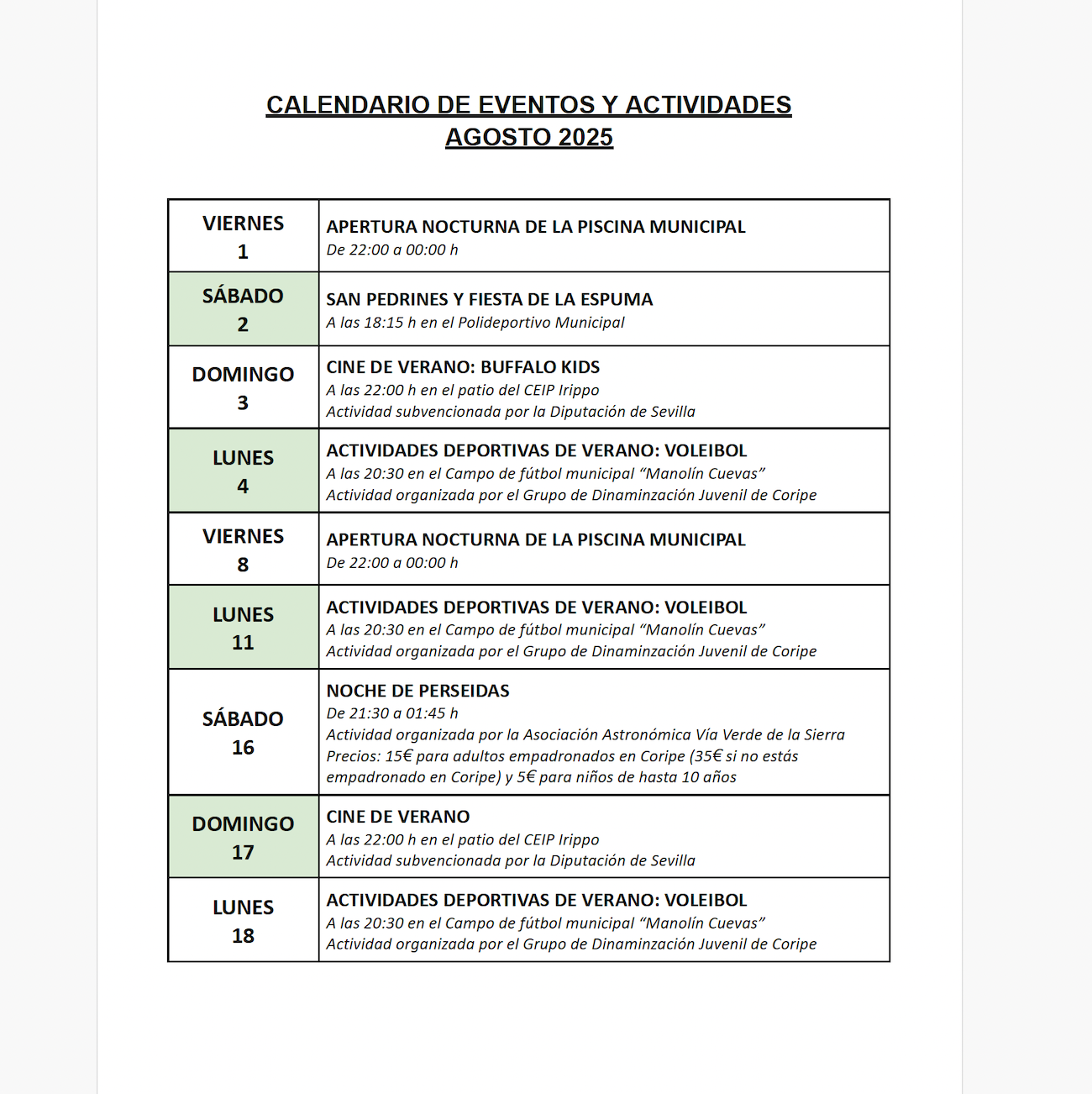 Publicado el calendario de actividades para este mes de Agosto de 2025