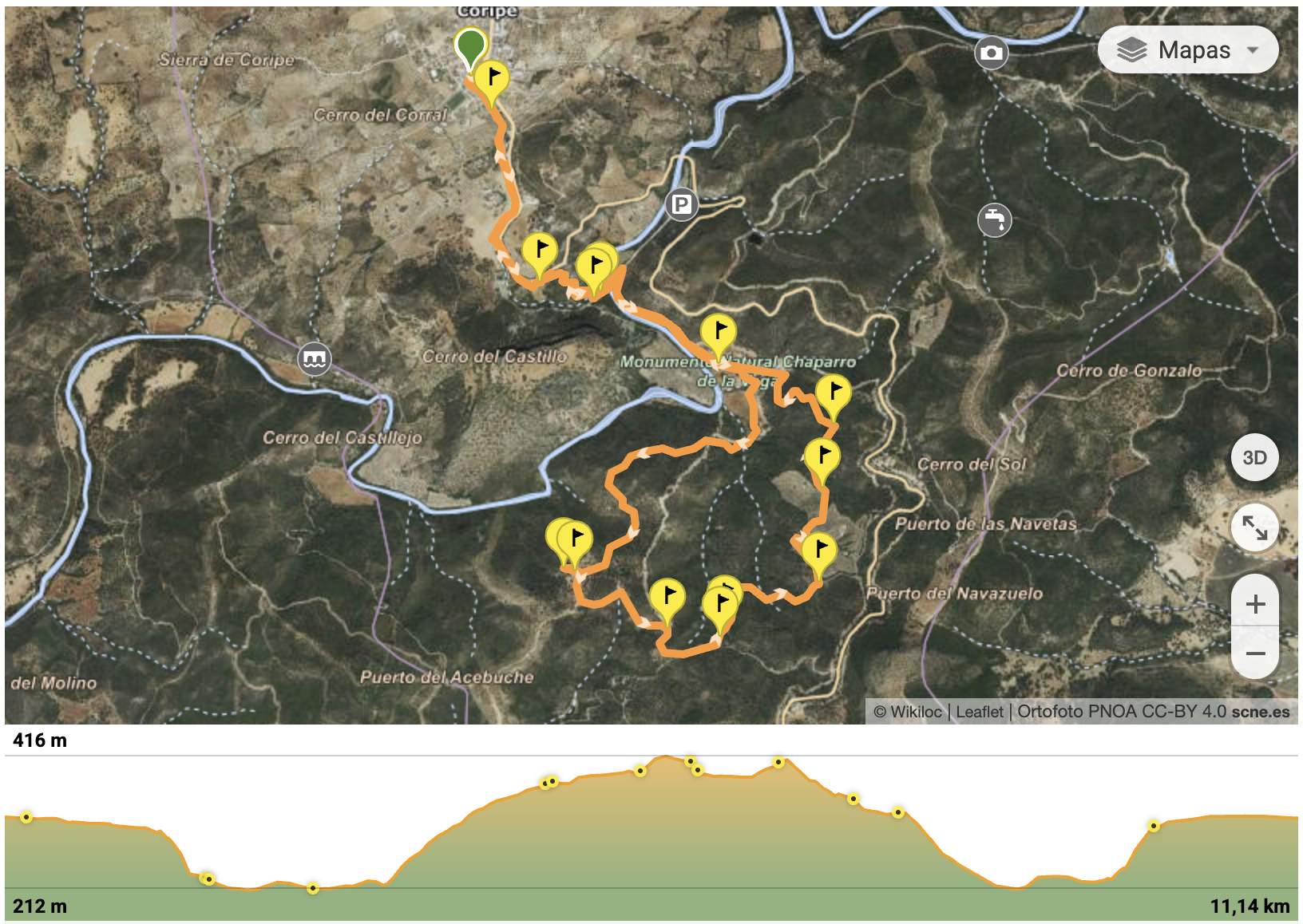 Tras el paso por el Chaparro de la Vega comienza el ascenso de 200 metros, hasta llegar al CORTIJO de las MAJADILLAS, allí tendremos unas impresionantes vistas (foto). También pasaremos por la FUENTE DEL PILAR, una antigua fuente restaurada…. que merece una buena foto. Tras la fuente del Pilar, pasaremos muy cerca de la "FUENTE LA PALOMA" y desde la misma volveremos a llegar al CHAPPARRO DE LA VEGA, repitiendo los dos últimos km, para finalizar en Coripe en el Km 0.