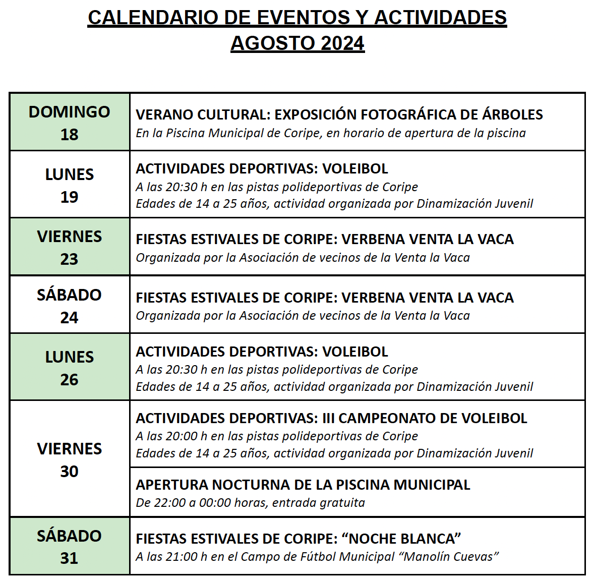 Publicado el calendario de actividades para este mes de Agosto de 2024