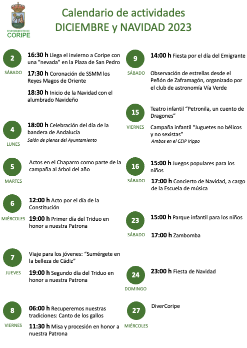 Publicado el calendario de actividades para este mes de Dicimebre y Navidad de 2023