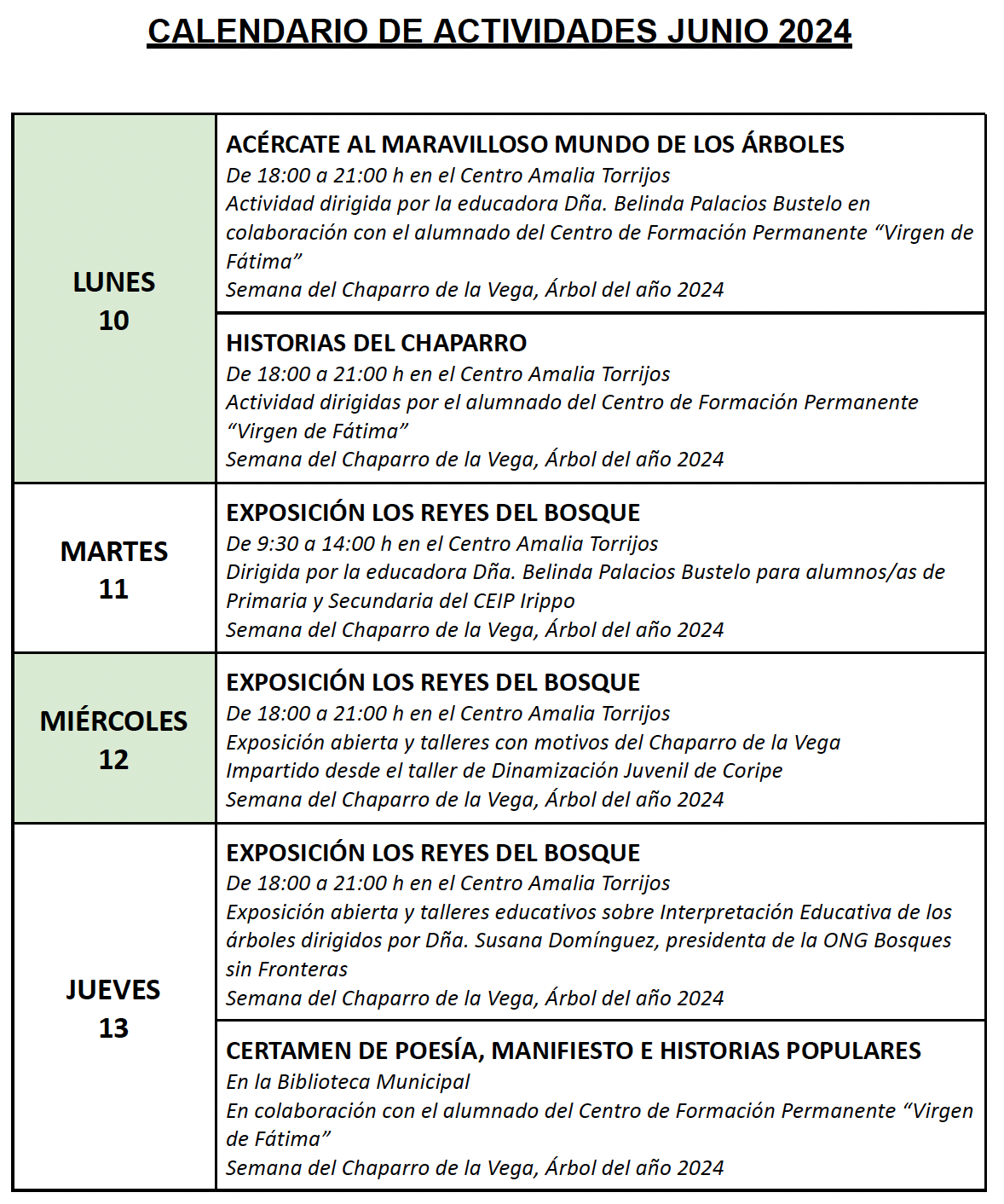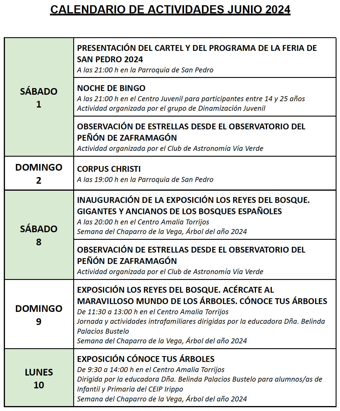 Publicado el calendario de actividades para este mes de Junio de 2024