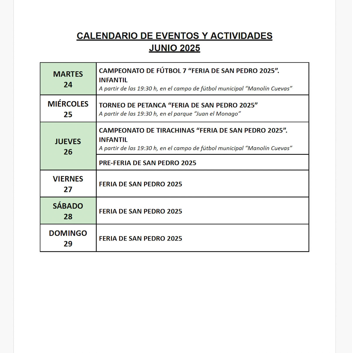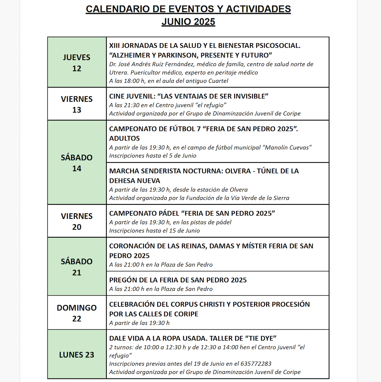 Publicado el calendario de actividades para este mes de Junio de 2025