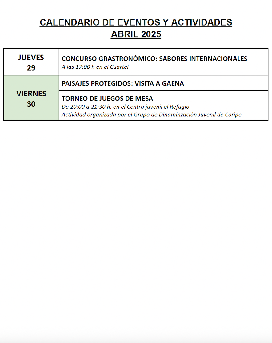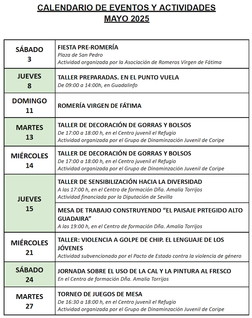 Publicado el calendario de actividades para este mes de Mayo de 2025