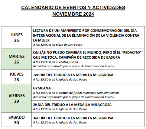 Publicado el calendario de actividades para este mes de Noviembre de 2024