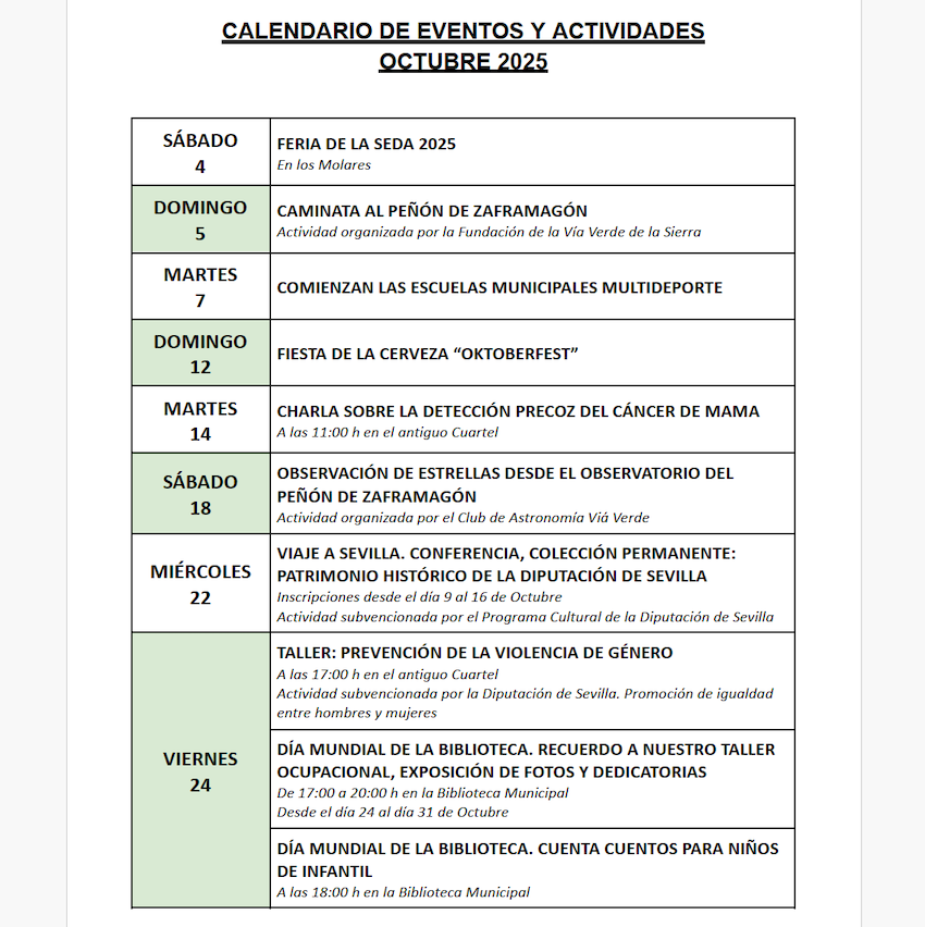 Publicado el calendario de actividades para este mes de Octubre de 2025