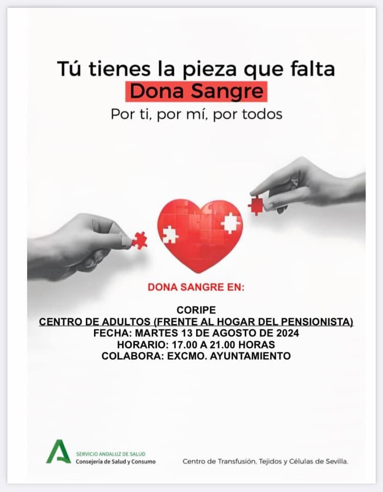 EL MIÉRCOLES 13 DE AGOSTO habrá una campaña de donación de sangre en CORIPE. Será en EL CENTRO DE ADULTOS (ANTIGUO CUARTEL DE LA GUARDIA CIVIL) en horario de 17.00 a 21.00 horas. COLABORA: EXCMO. AYUNTAMIENTO. Se necesita sangre de todos los grupos.