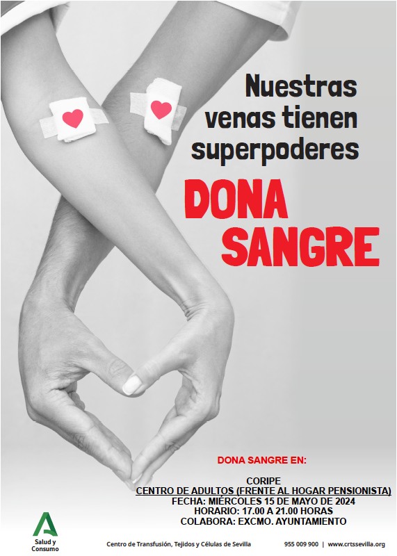 EL MIÉRCOLES 15 DE MAYO habrá una campaña de donación de sangre en CORIPE. Será en EL CENTRO DE ADULTOS (ANTIGUO CUARTEL DE LA GUARDIA CIVIL) en horario de 17.00 a 21.00 horas. COLABORA: EXCMO. AYUNTAMIENTO. Se necesita sangre de todos los grupos.