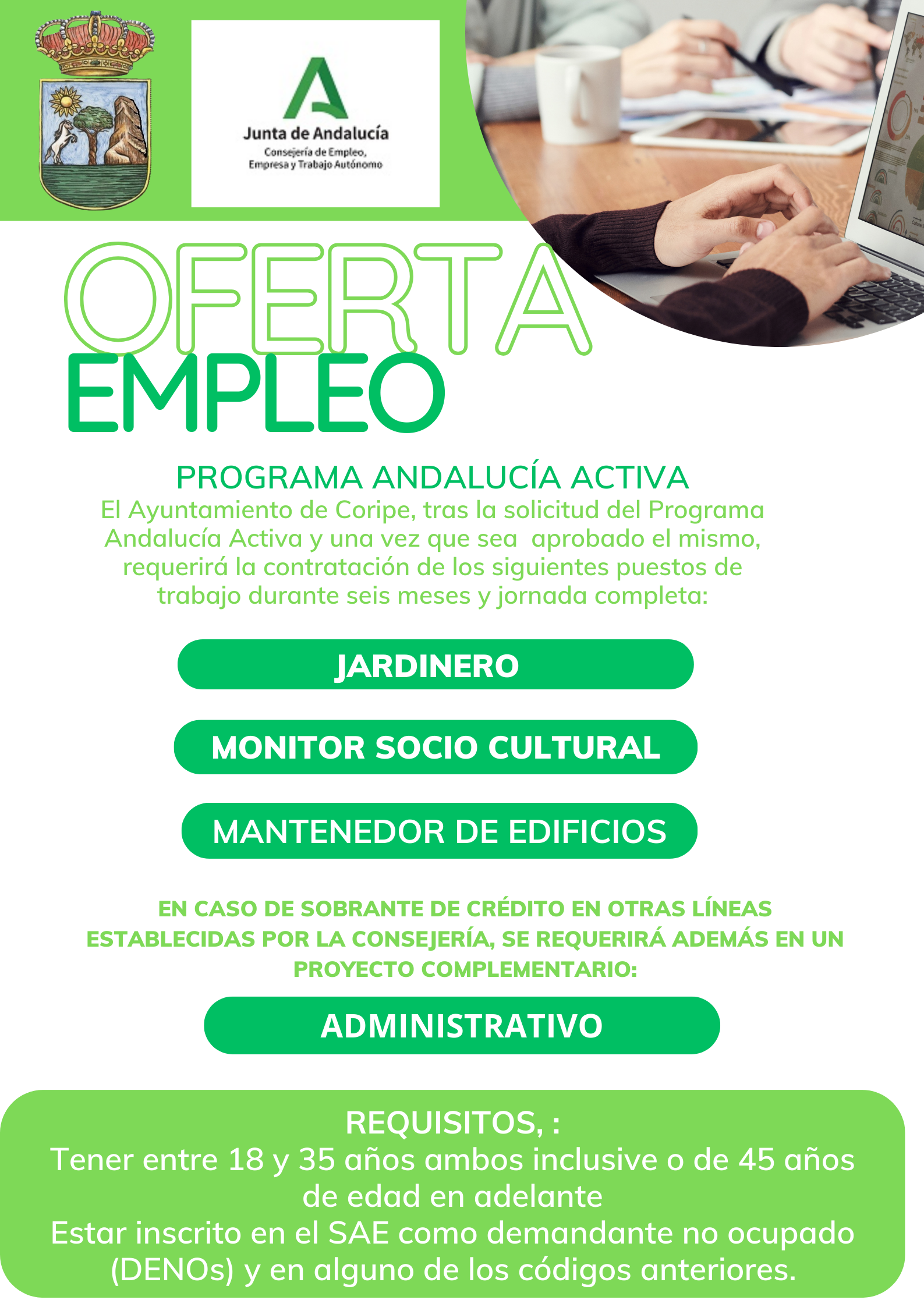 El Ayuntamiento de Coripe, tras la solicitud del Programa Andalucía Activa y una vez que sea aprobado el mismo, requerirá la contratación de los siguientes puestos de trabajo durante seis meses y jornada completa: