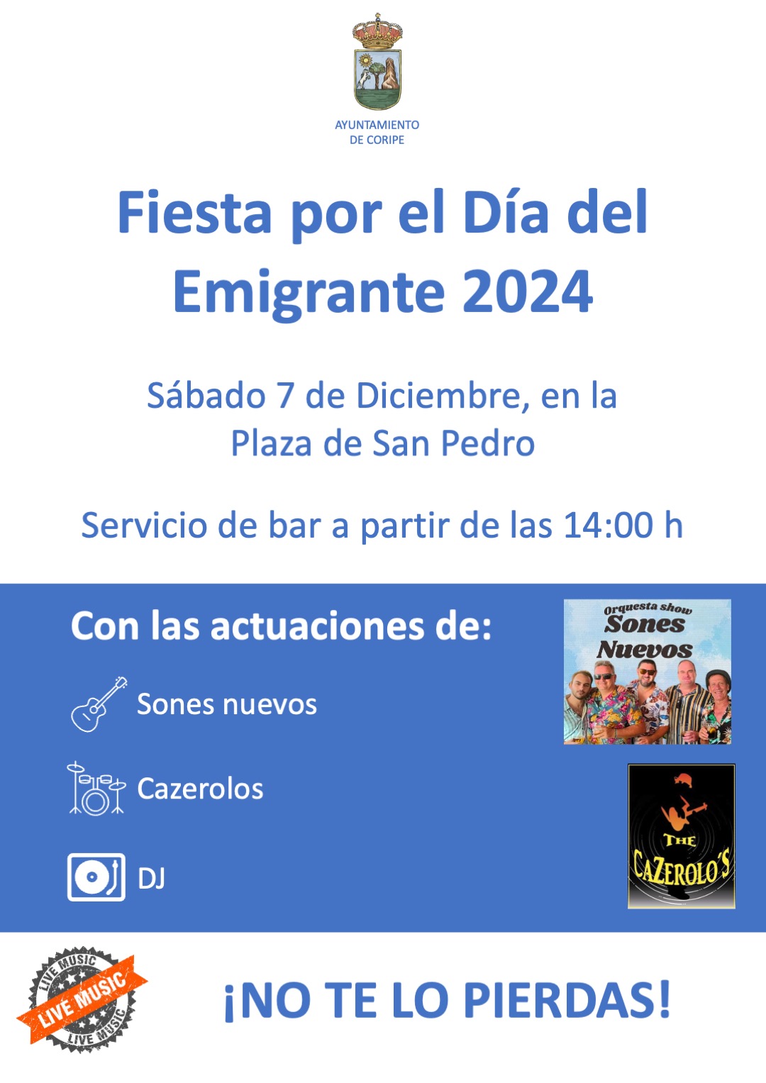 Servicio de bar y música, y desde las 17:00 h actuaciones en directo de SONES NUEVOS, LOS CAZEROLOS y DJ