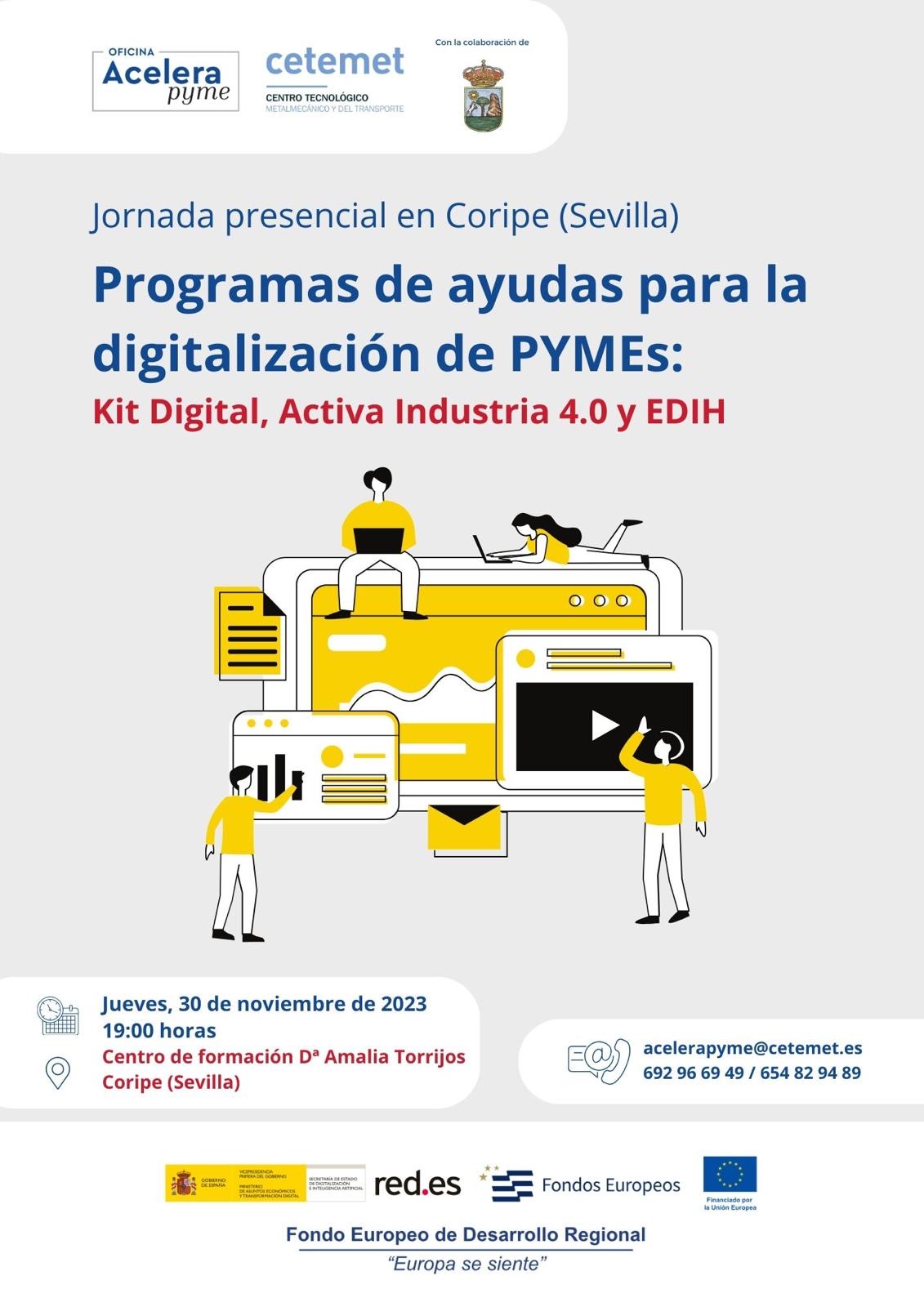 De la mano de CETEMET y con la colaboración del Ayuntamiento de Coripe, se celebrán estas jornadas de de información y asesoramiento sobre el programa de ayudas para digitalización de PYMEs: Kit digital, Activa industria 4.0 y EDIH.
