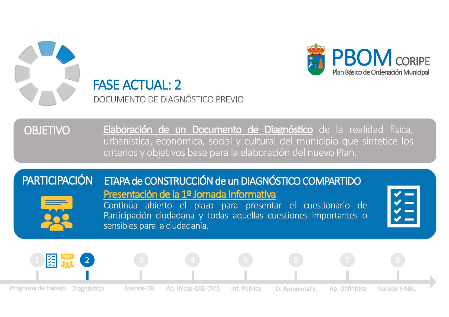 La elaboración del Plan Básico de Ordenación Municipal de Coripe será una tarea cuya duración será de aproximadamente 1 año y que se dividirá en las siguientes fases, siendo necesaria la participación de todos/as los/las vecinos/as de Coripe con el objetivo de elaborar un Plan acorde a todas las necesidades e inquietudes de nuestro pueblo.