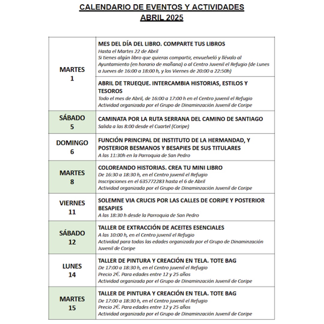 Publicado el calendario de actividades para este mes de Abril de 2025