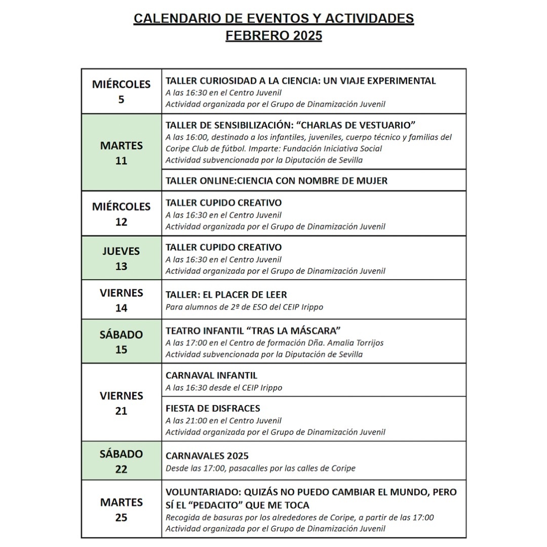 Publicado el calendario de actividades para este mes de Febrero de 2025