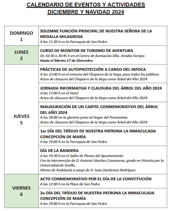 Publicado el calendario de actividades para este mes de Diciembre y Navidad de 2024