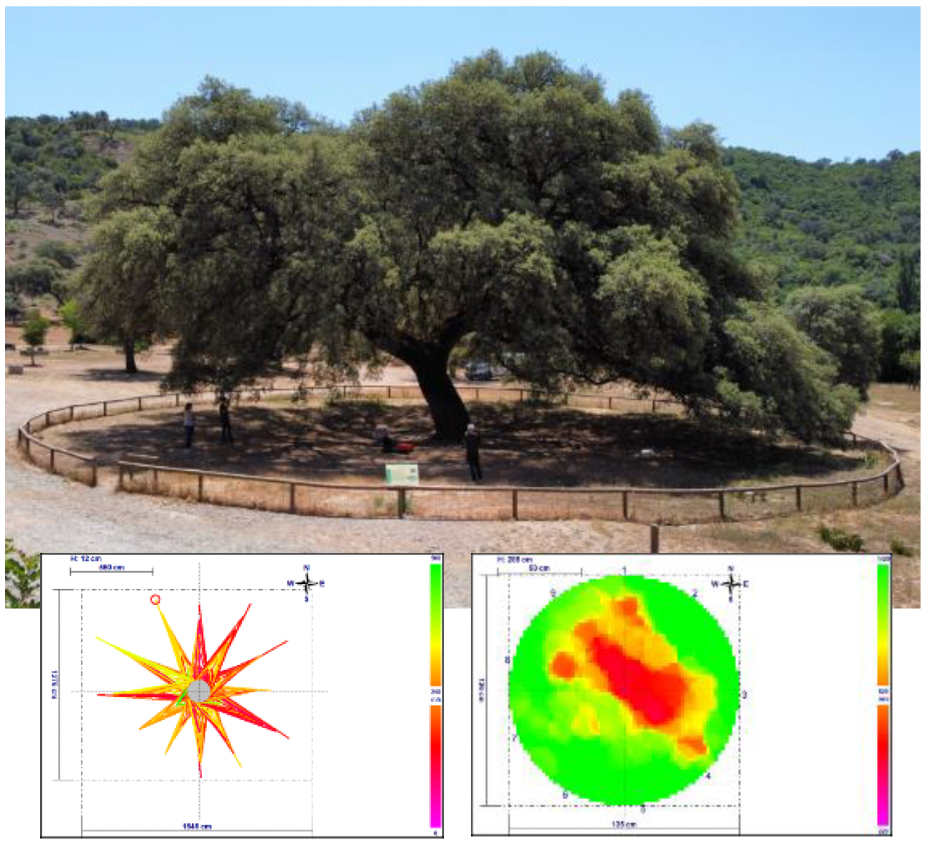 El peor estado de la madera se localiza en la zona central y el sector noroeste (NW) (tonos rojizos), sin embargo, el árbol mantiene un buen estado de la madera en la mayor parte de la albura (parte que proporciona estabilidad). Además, se observa un peor estado de la madera en las zonas deprimidas del tronco, mientras el árbol mantiene un excelente estado de la madera sobre los potentes cordones cambiales que otorgan estabilidad al árbol (resultado propio de árboles maduros).
